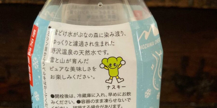 豪雪地帯の厳しい冬から生まれる自然の水。雪どけ水が長い時間をかけて濾過された湧水です。パッケージデザインは2種、雪だるまのシルエットに野沢温泉のアイコンとも言える鳩車と道祖神祭りのイラストをあしらったものと野沢温泉のゆるキャラ「ナスキー」バージョン。どちらも150円で野沢温泉のお土産屋さん、酒屋さんで販売中です。